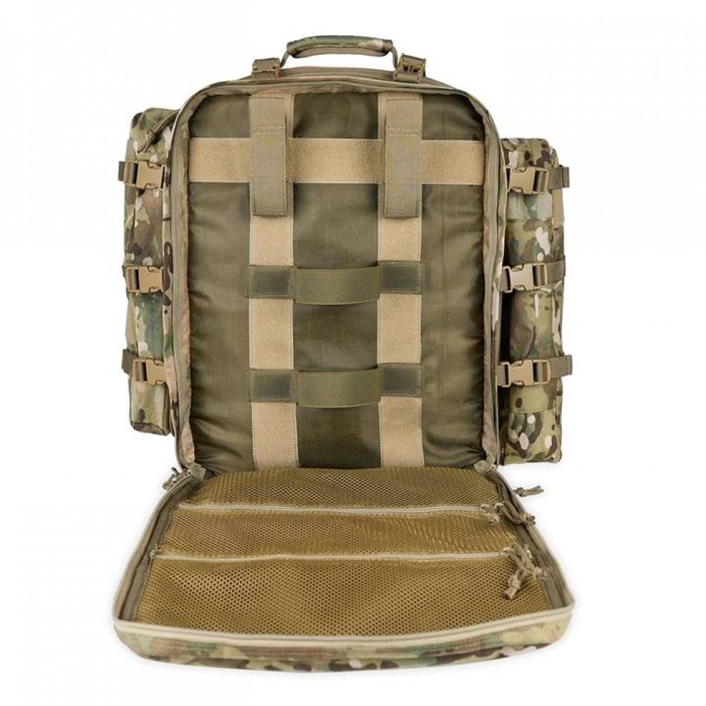 Тактический медицинский рюкзак Rhino Rescue R40 представлен в камуфляжном стиле "мультикам" и имеет объем 40 литров. Рюкзак разработан для профессионального использования и характеризуется сложной структурой с множеством карманов и отсеков для хранения медицинских принадлежностей и инструментов.